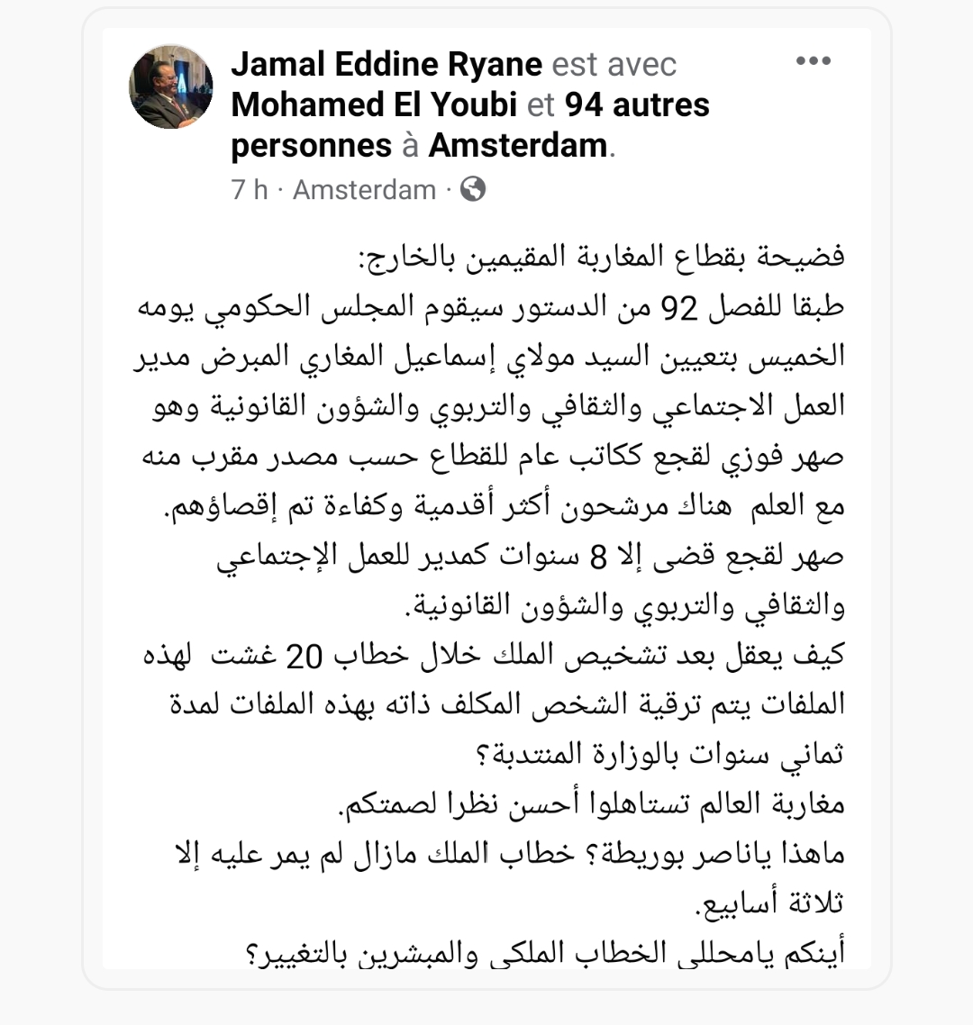 كيف يعقل بعد تشخيص الملك خلال خطاب 20 غشت لهذه الملفات يتم ترقية الشخص المكلف ذاته بهذه الملفات لمدة ثماني سنوات بالوزارة المنتدبة؟