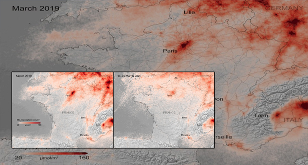 وأظهرت الصور الملتقطة عبر القمر الصناعي “سنتينل-“5، تراجع متوسط مستويات ثاني أوكسيد النيتروجين الضار في مدن من بينها بروكسيل، وباريس، ومدريد، وميلانو، وفرانكفورت خلال الفترة ما بين 5 و 25 مارس الجاري مقارنة مع الفترة ذاتها من العام الماضي.
