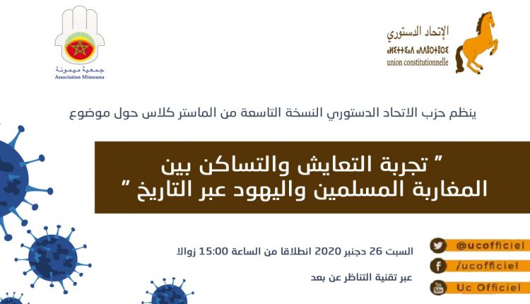 ينظم حزب الاتحاد الدستوري يوم السبت 26 دجنبر 2020, النسخة التاسعة من “الماستر كلاس” بتعاون مع جمعية ميمونة لليهود المغاربة حول موضوع ” تجربة التعايش والتساكن بين المغاربة المسلمين واليهود عبر التاريخ ” .