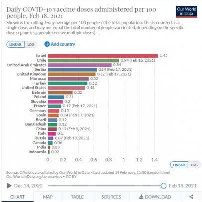 ويتموقع المغرب في المركز السادس، على مستوى النسبة المئوية للملقحين يوميا ب0.53، في المئة وفق آخر احصائيات ليوم امس.