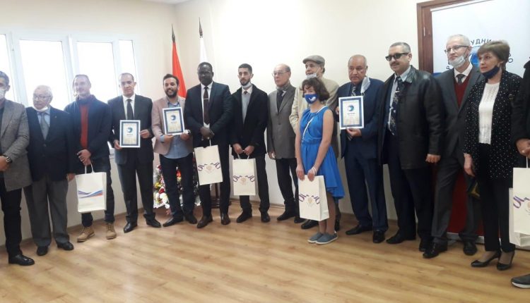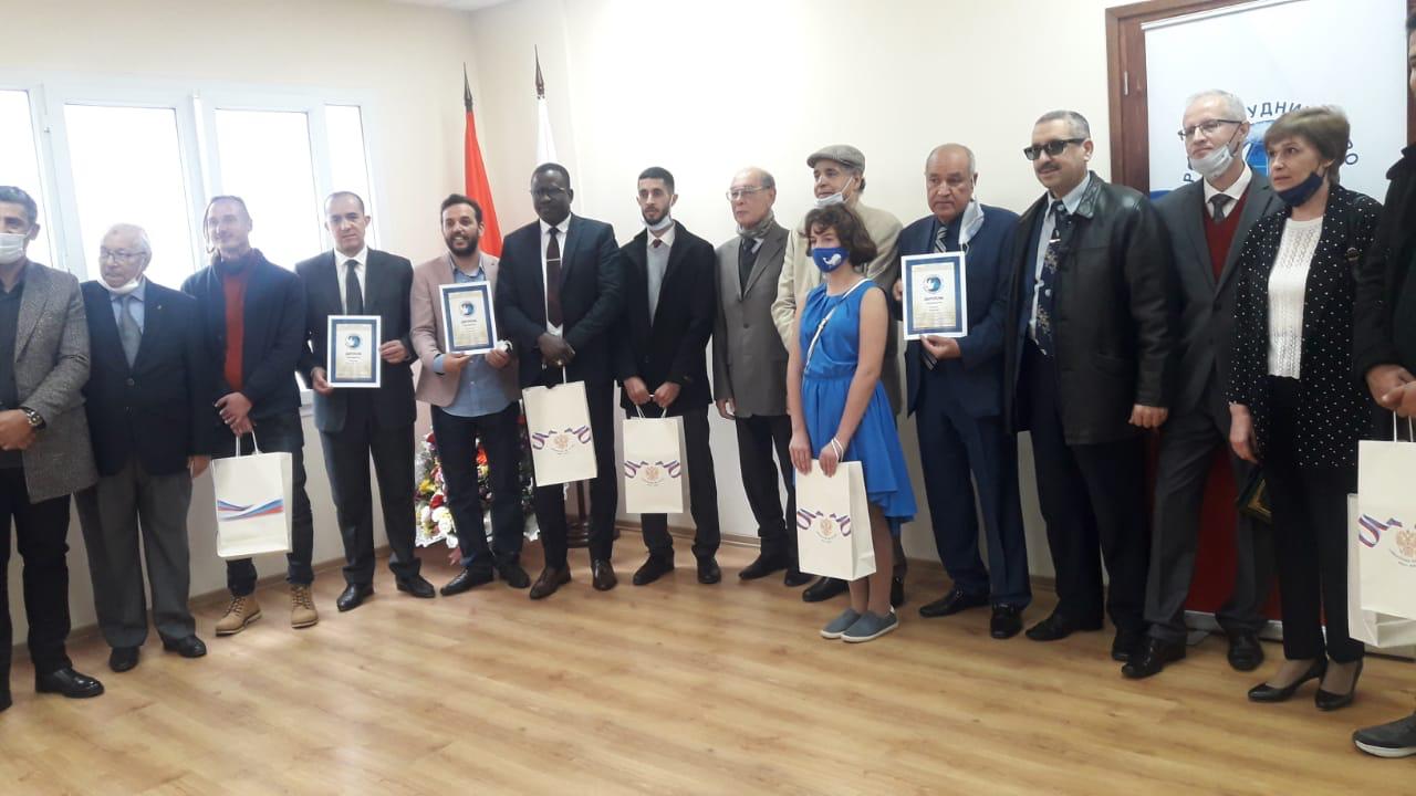 ومن جهة أخرى وبمناسبة الذكرى 95 للمركز الروسي للتعاون الدولي العلمي والثقافي و الإنساني تم تكريم شخصيات مغربية بشواهد الاستحقاق للعمل والتعاون الثقافي والعلمي بين روسيا والمغرب محمد بنحساين مدير مسرح محمد الخامس سمير المشرفي رئيس المغربية تنمية الصداقة المغربية الروسية و محمد فاقيري رئيس الجمعية المغربية لخريجي الجامعات والمعاهد السوفياتية سابقا.