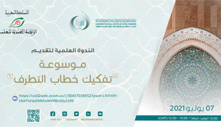 تعقد منظمة العالم الإسلامي للتربية والعلوم والثقافة (إيسيسكو)، بالتعاون مع الرابطة المحمدية للعلماء في المملكة المغربية، بعد غد الأربعاء (7 يوليو 2021)، ندوة علمية لتقديم الجزء الأول من “موسوعة تفكيك خطاب التطرف”، الذي تم إنجازه في إطار اتفاقية الشراكة بين الإيسيسكو والرابطة، من أجل التمنيع الفكري للشباب المسلم من مختلف خطابات التطرف والكراهية، في دول العالم الإسلامي وخارجه.
