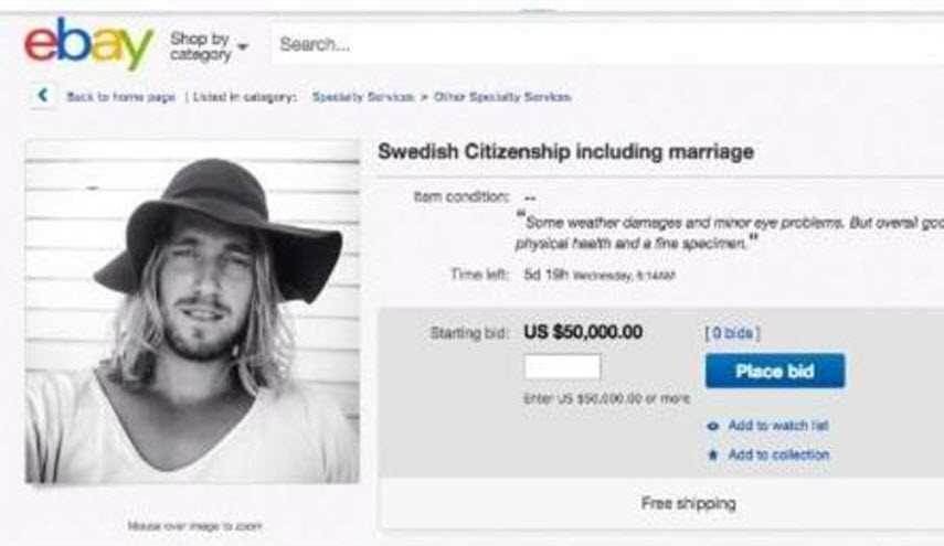 نشر رجل سويدي إعلانا للأميركيين الراغبين في مغادرة بلادهم، بعد فوز دونالد ترامب بالرئاسة الأميركية، تضمن دعوة للحصول على المواطنة السويدية مع الزواج، ووضع مزاداً على ذلك، بحيث يتاح لمن يدفع أكثر أن ينال حظه.