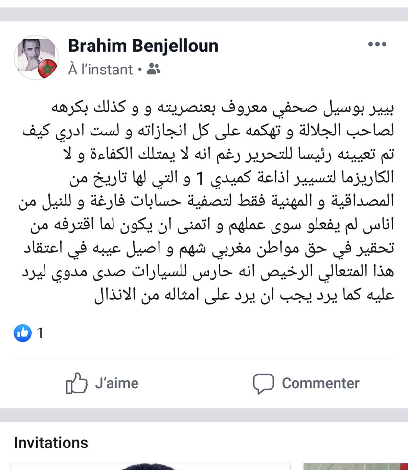 وكتب مسؤول الانتاج ابراهيم بنجلون، تدوينة خطيرة قال قيها ان رئيس التحرير الجديد لا كفاءة له ويهاجم المنجزات ويهاجم كذلك أعلى سلطة في البلاد..