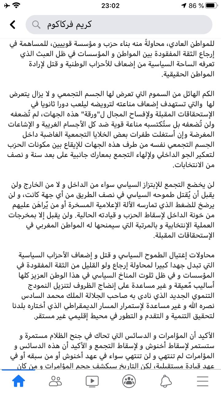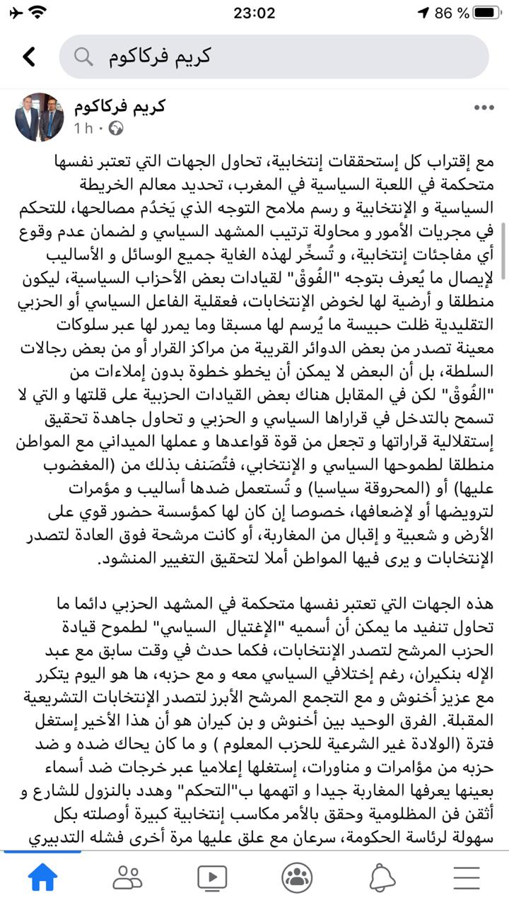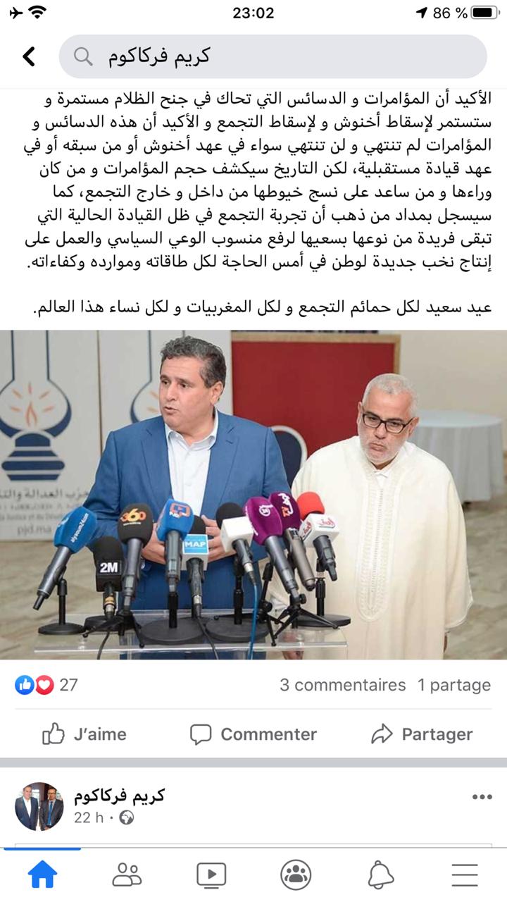 أنفار من شبيبة أخنوش تداولوا منشورا مطولا على مواقع التواصل الاجتماعي أجروا من خلاله مقارنة بين ما تعرض له بنكيران وبين ما يتعرض له أخنوش، مع فرق بسيط في المقارنة، إذ أكدوا في ذات المنشور أن بنكيران كان دائما يستجدي ويتهم جهات بعينها بـ”التحكم”، بينما حاولوا إظهار أن أخنوش التزم الصمت دون أن يتبنى خطاب المظلومية.