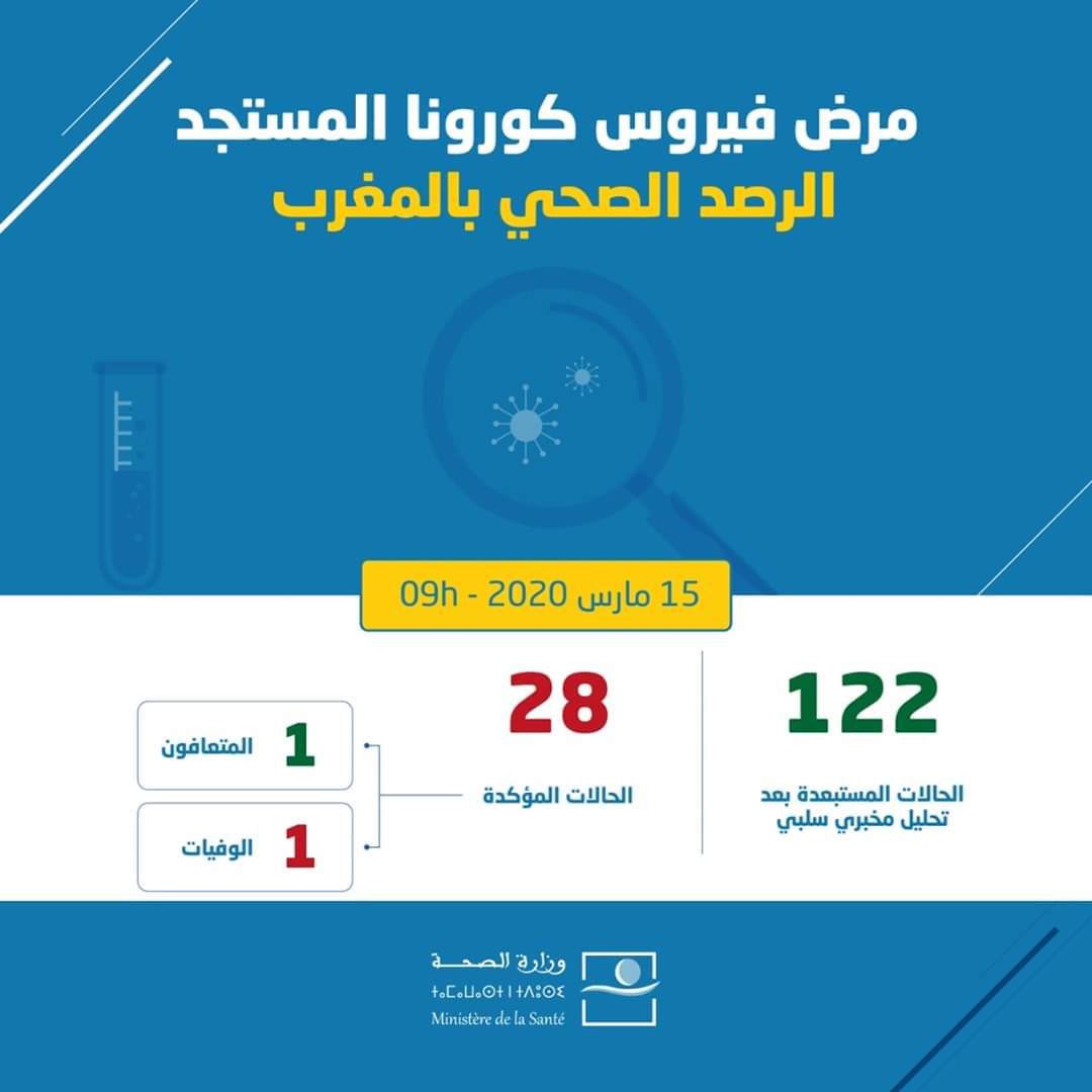 أعلنت وزارة الصحة عن تسجيل 11 حالة إصابة جديدة بفيروس كورونا بالمغرب، ليكون بذلك العدد الإجمالي للحالات المؤكدة إصابتها بمرض كوفيد-19، هو 28 حالة بالمملكة إلى حدود اليوم الأحد.
