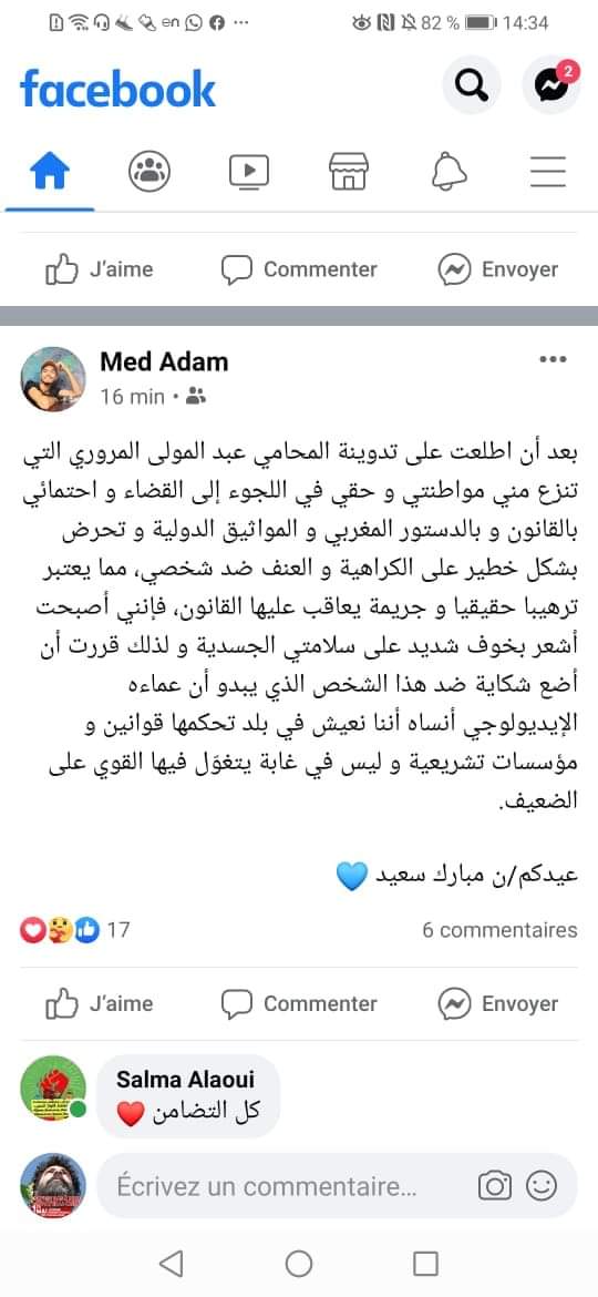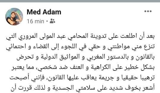 وقرر المحامي الاسلامي المروري الترافع عن الصحافي الريسوني الموقوف في قضية الشاب المثلي آدم.