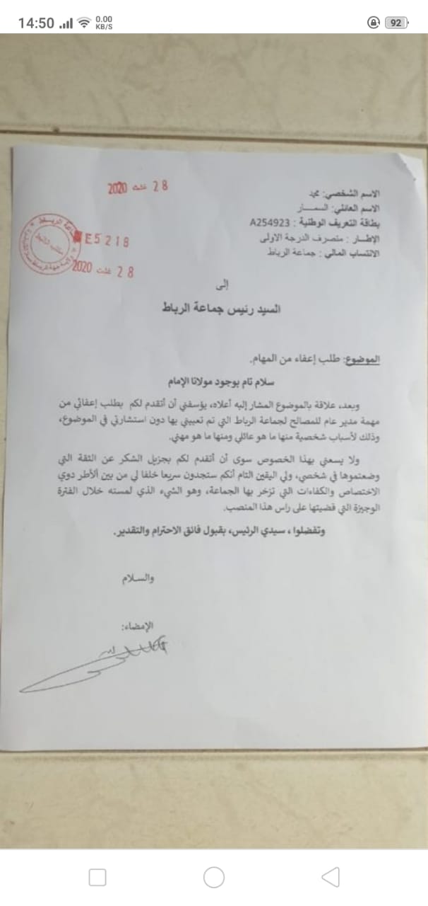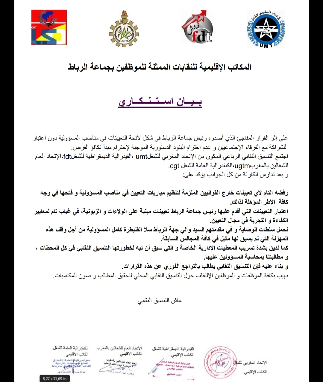 و الحال أن المتتبع للشأن المحلي أصبح يشمئز من حالة الفوضى و الارتباك التي أدت للجمود التام الذي تعيشه جماعة العاصمة منذ تولي حزب العدالة و التنمية مسؤولية تدبير هذه المؤسسة ، حيت عبرت المعارضة في عديد المحطات عن سوء التسيير و الارتجالية في اتخاذ القرارات الشيء الذي جعل الرباط تعيش على صفيح ساخن خلال 5 سنوات عجاف وصلت حد البلوكاج الذي أدى إلى ضياع مكتسبات الموظفين و مصالح المواطنين، في ظل استفراد 3 نواب بالقرار السياسي و الإداري ناهيك عن الفراغ الذي خلفه شغور منصب المدير العام منذ إقالة بوجمعة الدرعي الكاتب العام السابق دون مبرر يذكر و إعفاء المرحومة نورة كيلاني المشهود لها دوليا بالكفائة في العلاقات العامة و التضييق على عدد كبير من الأطر التي غادرت الجماعة في اتجاه مجلس العمالة أو اضطرت لطلب التقاعد النسبي هربا من جو محموم و حالة اللا تقة بين العمدة و الأطر الإدارية و الاحتقان الاجتماعي الذي تعيشه الشغيلة الجماعية المحرومة اليوم من حقها في التعويضات الخاصة بالساعات الإضافية و الأشغال الشاقة و الملوثة و الترقيات المتراكمة لسنوات خلت ، الشيء الذي عبرت عنه النقابات من خلال التنسيق الرباعي بالإضافة لأدانتهم بشدة التعيينات المشبوهة لعدد من رؤساء الأقسام و أعضاء الديوان مطالبين بإلغائها الفوري لكونها تشكل خرقا سافرا لكل المبادئ الدستورية و النصوص القانونية المؤطرة ،مع الدعوة لاحترام مبادئ النزاهة و الشفافية الضامنة لقيم المساواة و تكافؤ الفرص أمام كل الأطر و الكفاءات، و هو الشيء الذي أكدته رسالة السيد والي جهة الرباط التي اعتبرها المتتبعون للشأن المحلي صفعة قوية تنضاف لها الفضيحة التي فجرها اليوم بجرأة كبيرة السيد محمد السمار الذي عرى عن واقع العبث و اللا مسؤولية و الجهل المركب بالأعراف والمساطر القانونية و الإدارية المتبعة في اختيار الكفاءات لمناصب المسؤولية حيت تقدم لرئيس الجماعة بطلب الإعفاء من مهمة مدير عام للمصالح لجماعة الرباط التي تم تعيينه بها دون استشارته في الموضوع.