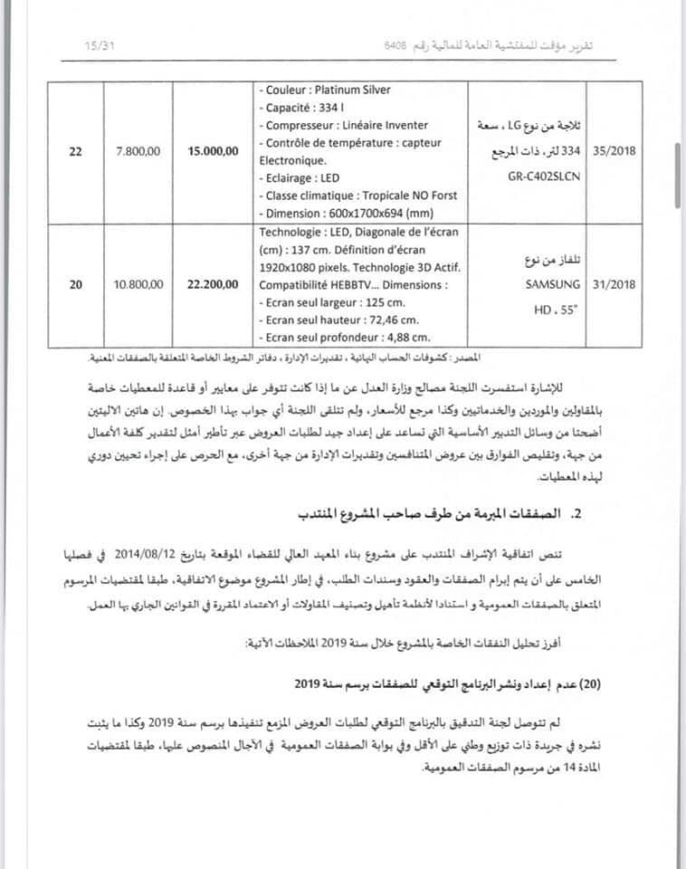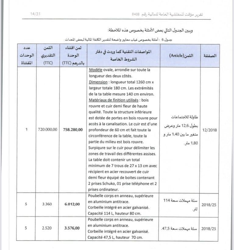 بحيث بلغ الغلاف المالي لشراء طاولة اجتماعات بطول 12،6 متر وعرض متغير مابين 1.40و1.80 متر بمبلغ مالي إجمالي قدره 758 ألف درهم، سلة مهملات سعة 114متر بمبلغ 6012درهم، سلة مهملات سعة 47,5 لتر بمبلغ 3576درهم، ثلاجة من نوع LG سعة 334 لتر بمبلغ مالي قدره 15000درهم،وتلفاز من نوع SUMSUNG ب 22.200 درهم.