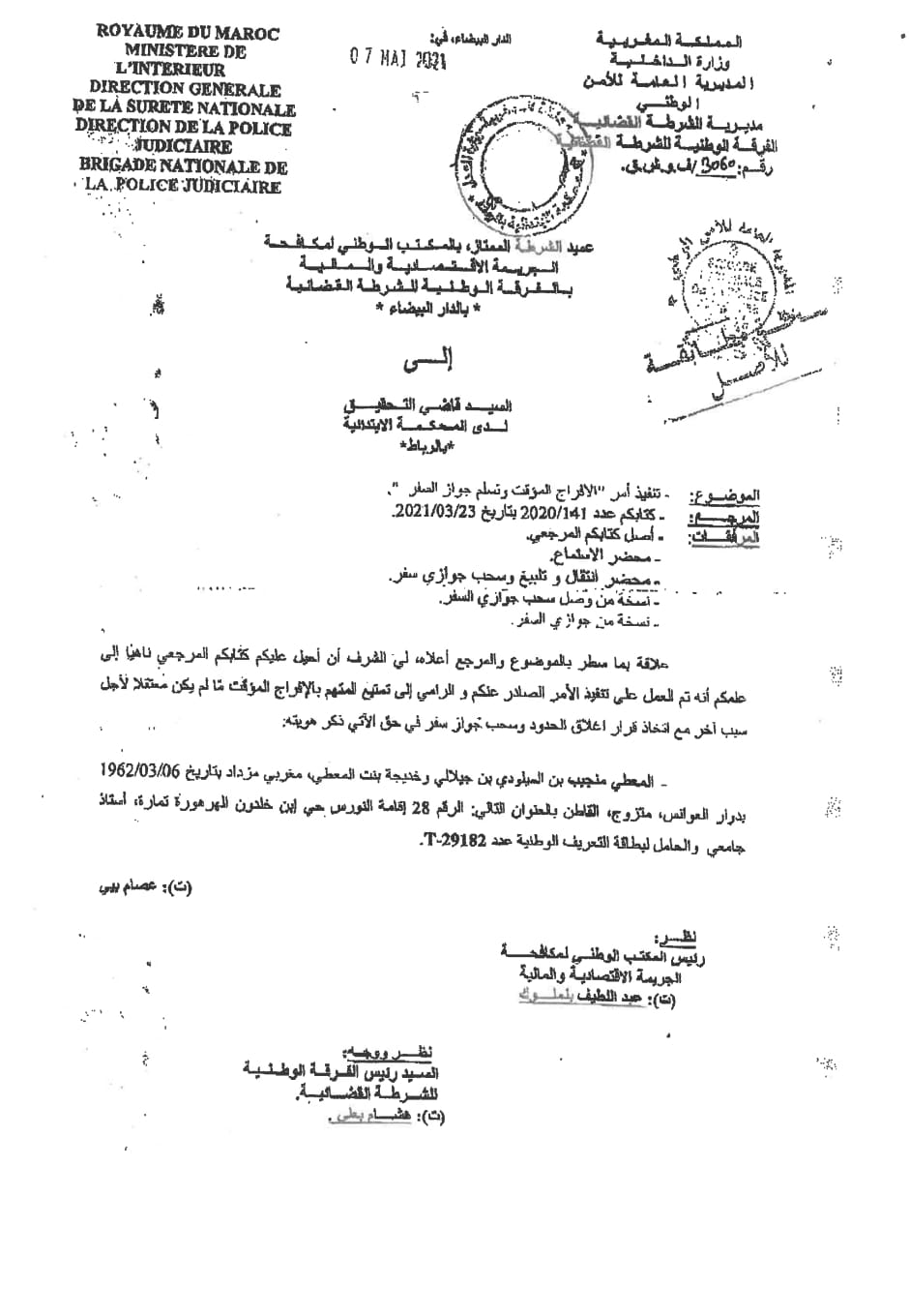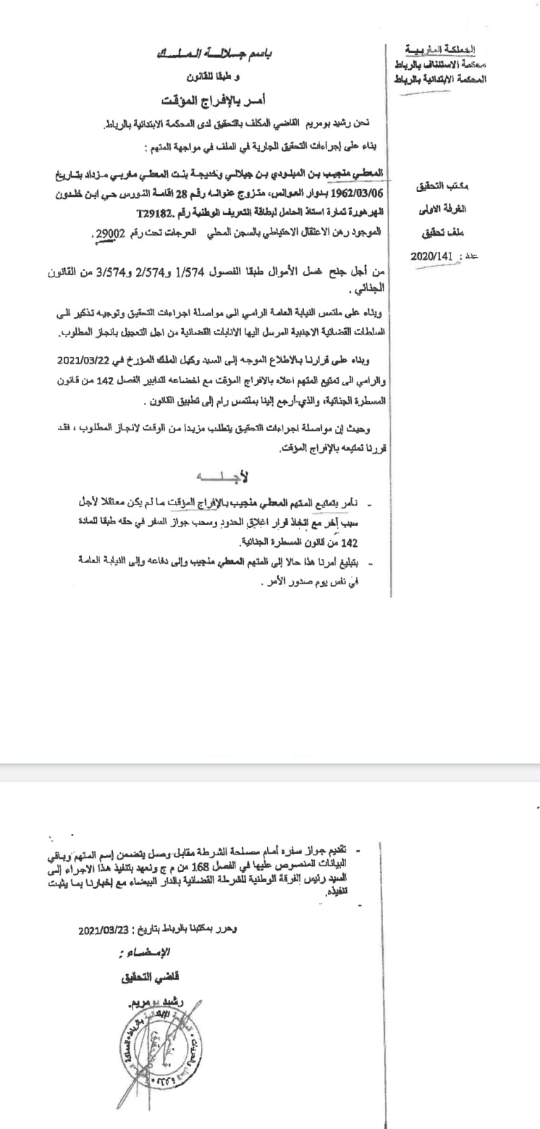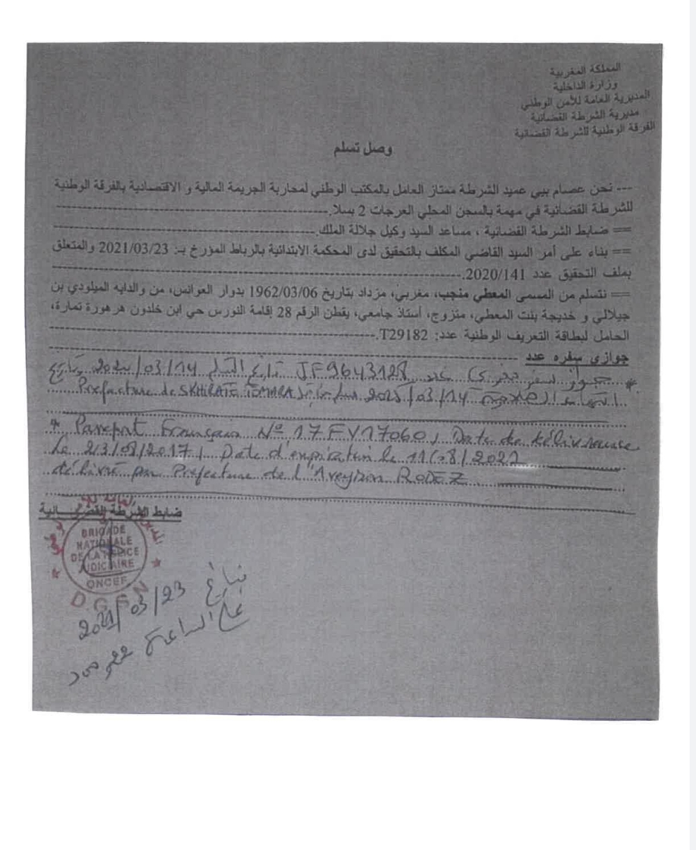 – أنه بنفس التاريخ 23 مارس 2021 وتنفيذاً لأمر السيد قاضي التحقيق، انتقل ضابط الشرطة القضائية المكلف بتبليغ الأمر القضائي إلى سجن العرجات 2، حيث أنجز محضراً وقع عليه المعني بالأمر، تضمن تبليغ قرار السراح المؤقت إليه. وبخصوص سحب جوازي السفر تضمن المحضر استنادا إلى جواب المعني بالأمر أنه يتوفر على جوازي سفر أحدهما مغربي والآخر أجنبي وأنهما لا يوجدان ضمن أمتعته بالمؤسسة السجنية؛