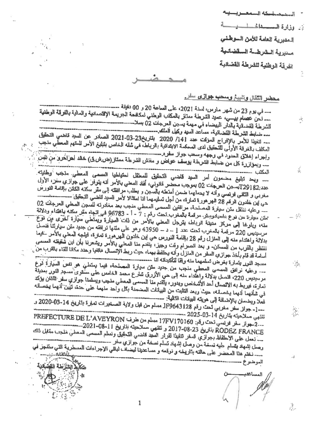 – أنه بتاريخ 23 مارس 2021 انتقلت عناصر الشرطة القضائية رفقة المعني بالأمر بعد مغادرته السجن إلى منزله حيث أفادهما أن جوازي السفر يتواجدان بحوزة ابن أخيه حيث انتقل معهما من جديد إلى حيث يوجد المعني بالأمر وهناك سلمهما جوازي السفر. وبالمقابل سلمته عناصر الشرطة القضائية بنفس التاريخ وصلا مقابل ذلك.