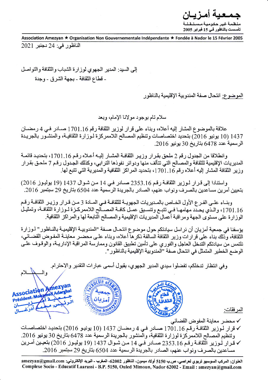 ووجهت مراسلة أخرى إلى السيد المدير الجهوي لوزارة الشباب والثقافة والتواصل – قطاع الثقافة – بجهة الشرق – وجدة، تم إيداعها بمكتب الضبط بتاريخ 24 دجنبر 2021، تلتمس من المدير الجهوي التدخل العاجل والفوري على تأمين تطبيق القانون وممارسة المراقبة الإدارية، والوقوف على الوضع الخطير المتمثل في انتحال صفة “المندوبية الإقليمية بالناظور”. وذلك بناء على قرارات وزير الثقافة السالفة ذكرها أعلاه، وبناء على محضر معاينة المفوض القضائي، وكذلك بناء على الفرع الأول الخاص بالمديريات الجهوية للثقافة في المادة 3 من قرار وزير الثقافة رقم 1701.16، والذي يحدد مهامها في تتبع وتنسيق عمل كافة المصالح اللاممركزة لوزارة الثقافة، وتمثيل الوزارة على مستوى الجهة ومراقبة أعمال المديريات الإقليمية والمصالح التابعة لها والمراكز الثقافية.