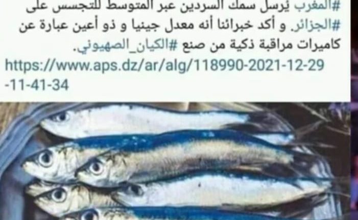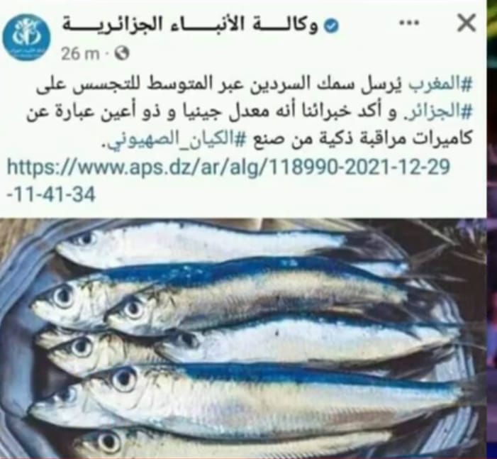 حسب ما تداولته وكالة الأنباء الجزائرية، أن المغرب يرسل ” سردينه الجاسوس” بعيون سحرية وقام بتغيير جيناته بخبرات اسرائيلية، وتداولت بعض مواقع التواقع التواصلية المدعومة من الجنرالات العسكرية الجزائرية، هذا الخبر الذي حاولت ترويجه، بعدما فشلت في نشر الاكاذيب والاشاعات المغرضة الكاذبة ضد جلالة الملك محمد السادس حفظه الله وضد الشعب المغربي وبعدما أجهزت على الرياضة على حساب السياسة بالاعتداء على اطفالنا ضمن المنتخب الوطني المغربي الأقل من 17 سنة .