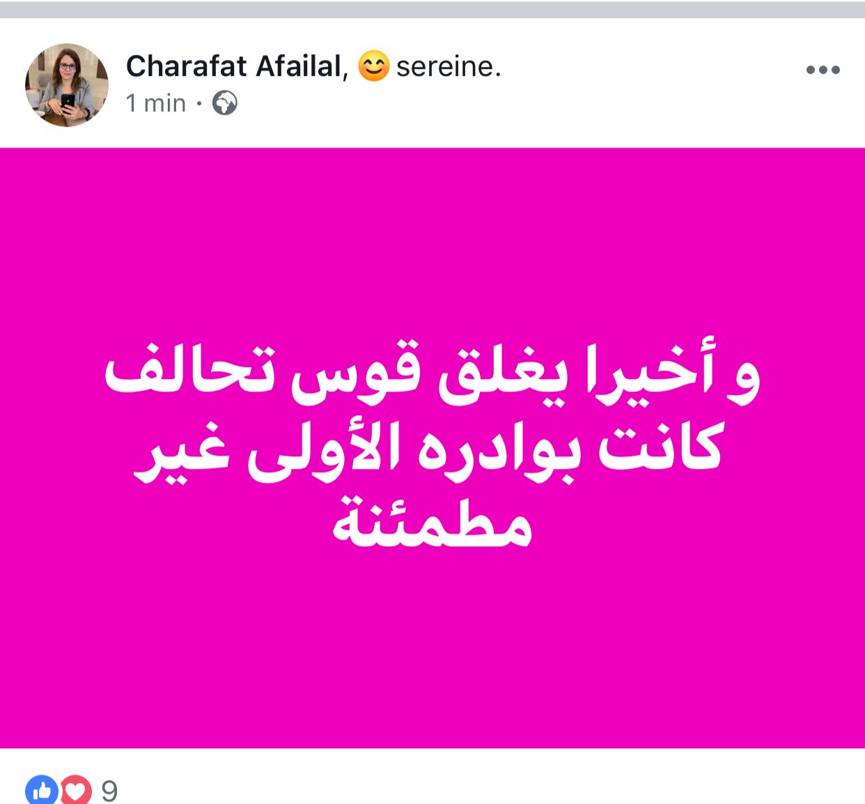 بعد قرار المكتب السياسي لحزب التقدم والاشتراكية الخروج من حكومة العثماني قبل التعديل الحكومي، خرجت عضوة المكتب السياسي الوزيرة السابقة شرفات افيلال بتدوينة تقول ” يغلق قوس تحالف كانت بوادره الأولى غير مطمئنة…”