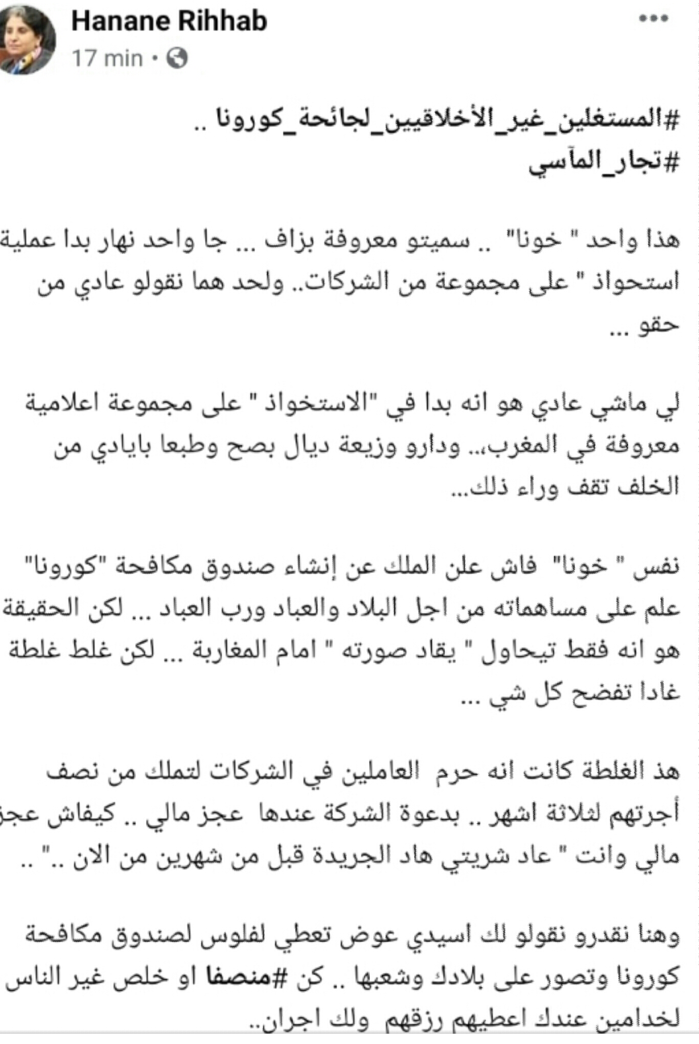 و أضافت رحاب في تدوينتها، ” عوض أن تتبرع لصندوق جائحة كورونا باش تصور على بلادك وشعبها، كن منصفا وخلص الناس اللي خدامين عندك وعطيهم رزقهم ولك أجران”.