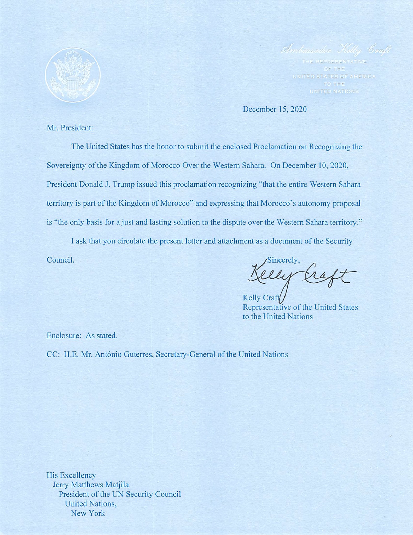 وجاء في الرسالة الموقعة من طرف كيلي كرافت ممثلة الولايات المتحدة لدى الأمم المتحدة أن “كل أرض الصحراء الغربية جزء من المملكة المغربية “.