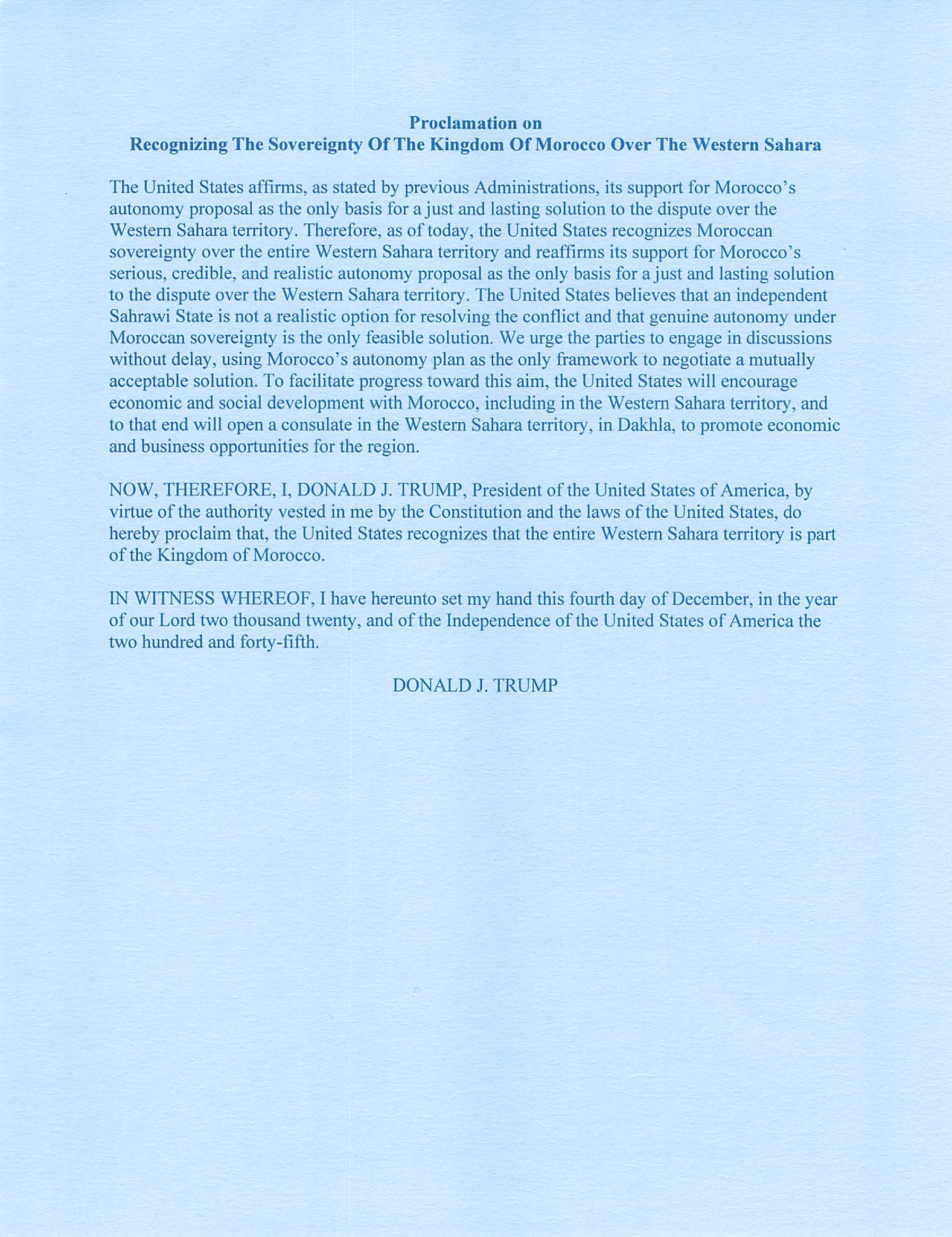 وكان الرئيس الأمريكي دونالد ترمب أعلن في الـ10 من ديسمبر الجاري، التوقيع على إعلان يعترف بالسيادة المغربية على إقليم الصحراء، مؤكداً أن مقترح المغرب بمنح الصحراء حكماً ذاتياً تحت سيادته “جاد وواقعي وهو الأساس الوحيد لحل عادل ودائم لتحقيق السلام الدائم والازدهار”.