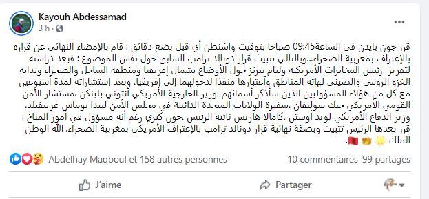 كشف نائب رئيس مجلس المستشارين، عبد الصمد قيوح، أن الرئيس الأمريكي “جون بايدن” قام في الساعة 09:45 من صباح اليوم بتوقيت واشنطن بالإمضاء النهائي على قراره بالاعتراف بمغربية الصحراء وبالتالي تثبيت قرار دونالد ترامب السابق حول نفس الموضوع.