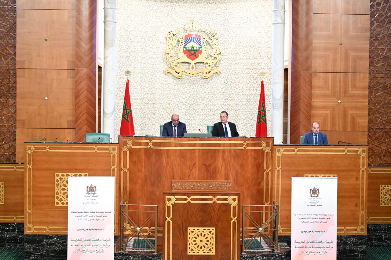 واضاف رئيس مجلس المستشارين” أن تعد هذه الندوة الوطنية إحدى ثمار هذه الدينامية، إذ تعتبر تجسيدا لخيار المجلس بالانفتاح وتوسيع المشاركة وذلك ضمن رؤية استراتيجية تروم ترسيخ المكانة الاعتبارية لمجلس المستشارين في الاضطلاع بالدبلوماسية البرلمانية، وتعزيز تماسك الجبهة الداخلية، وخدمة القضية الوطنية في مختلف أبعادها. لقد انتقلت المقاربة الدبلوماسية المغربية، خلال السنوات الأخيرة، إلى منطق المبادرة والاستباق، مرتكزة على شرعية تاريخية راسخة، وحجج قانونية قوية، ومشاريع تنموية طموحة، وقد أثمرت هذه المقاربة عن مكاسب وازنة، لعل أبرزها الدعم المتزايد لمبادرة الحكم الذاتي، التي أضحت تحظى باعتراف دولي واسع باعتبارها الحل الوحيد لانهاء النزاع المفتعل حول الصحراء المغربية، وهو ما تؤكده مواقف وازنة من شركاء أساسيين كـالولايات المتحدة الأمريكية، وإسبانيا، وفرنسا، وعدد من الدول الإفريقية والعربية الشقيقة والأوروبية الصديقة.