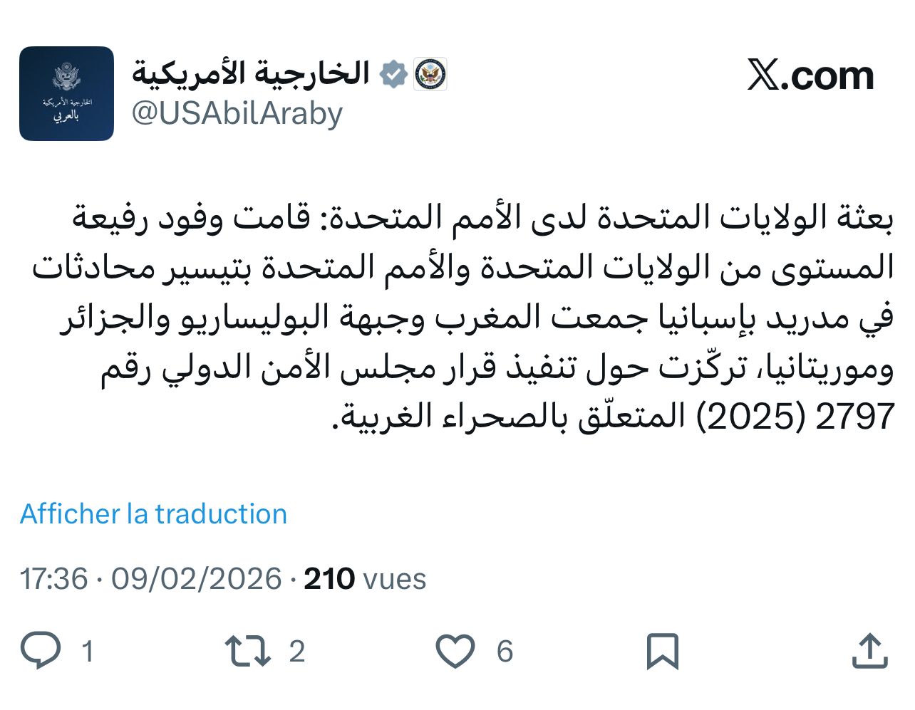 أكدت بعثة الولايات المتحدة الأمريكية لدى الأمم المتحدة المكلفة بالإشراف على محادثات مدريد، أن وفوداً رفيعة المستوى من الولايات المتحدة والأمم المتحدة، بالتعاون مع المغرب وجبهة البوليساريو والجزائر وموريتانيا، اجتمعت في مدريد لتسهيل الحوار حول قضية الصحراء المغربية.