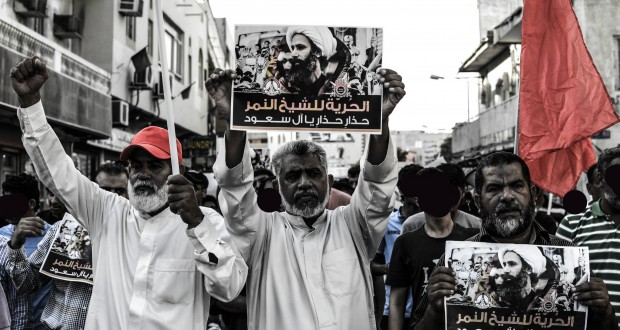 وردد المحتجون “يسقط آل سعود” بينما كانون يسيرون من قرية العوامية وهي مسقط رأس النمر إلى القطيف وهي المنطقة السعودية الوحيدة التي تقطنها غالبية شيعية.