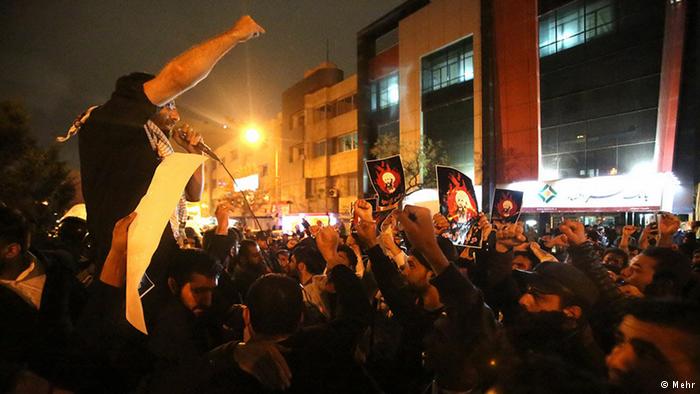 واحتشد المتظاهرون عند بوابات السفارة احتجاجا على إعدام النمر ثم اقتحموها وأشعلوا حرائق بداخلها قبل أن تجليهم الشرطة.