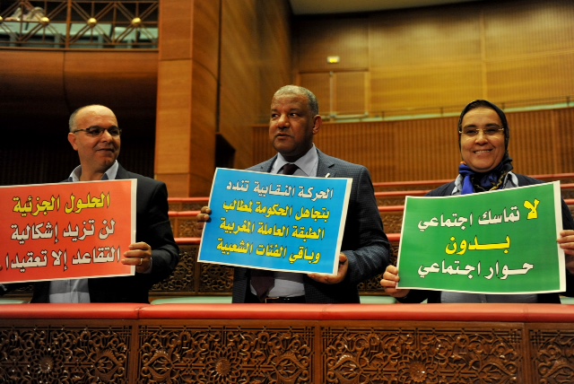 وفي أسلوب احتجاجي صامت، رفع أعضاء من مجلس المستشارين يافطات مكتوبة بالأحمر وبالأخضر، للاحتجاج على “تعنيف المحتجين” وللإعلان أن “لا تماسك اجتماعي بدون حوار اجتماعي”، في أسلوب احتجاجي من تحت قبة البرلمان.