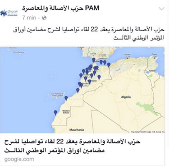 لكن الغريب كما ظهرت في الصورة التي نشرها البام في احدى صفحاته الفيسبوكية ان تكلم عن 22نطقة…في حين وضع على الاقاليم الجنوبية للممكلة عبارة”western sahara” وهو ما اثار استغراب العديد من المتتبعين في القول واش البام عندو مشكل مع الصحرا….