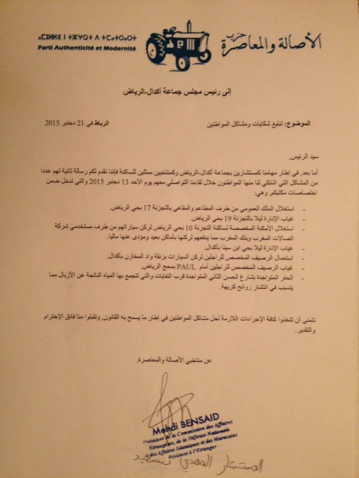 رغم ان مجرد مستشار في جماعة اكال الرباط، الا ان البرلماني الشاب الذي استفاد من لائحة الشباب، راسل رئيس جماعة اكدال الرياض بخصوص مشاكل تتعلق بساكنة الجماعة.