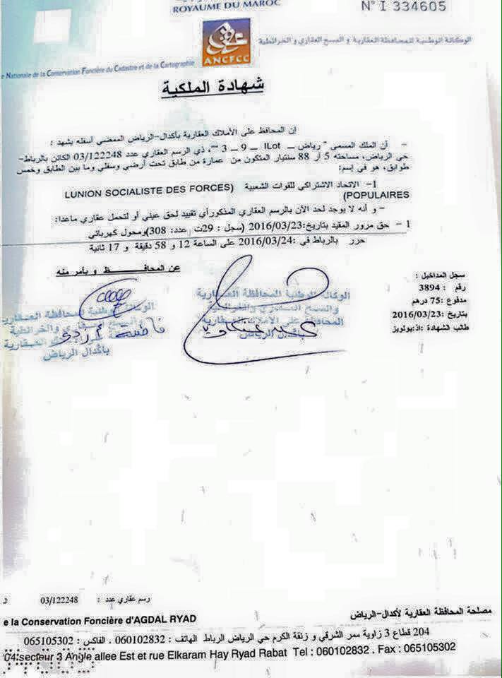 حصل إدريس لشكر الكاتب الأول للإتحاد الإشتراكي على رسم من المحافظة العقارية، يقضي بتحفيظ مقره الرئيسي بحي الرياض في ملكية الحزب بعدما كانت في ملكية الأشخاص.