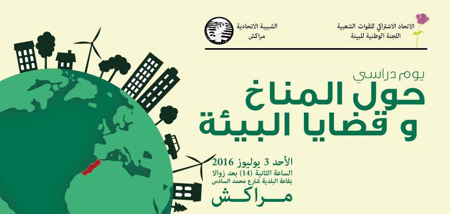 في إطار الدينامية التي تعرفها مختلف لجان و قطاعات الاتحاد الاشتراكي للقوات الشعبية و تنفيذا للبرنامج الذي سطرته اللجنة الوطنية للبيئة و في أفق إنعقاد مؤتمر الأطراف الخاص باتفاقية الإطار للأمم المتحدة بشأن التغير المناخي الذي ستحتضنه بلادنا في شهر نونبر القادم، تنظم اللجنة الوطنية للبيئة و الشبيبة الاتحادية بمراكش بشراكة مع الكتابة الاقليمية للحزب بمراكش و تحت إشراف المكتب السياسي للاتحاد الإشتراكي للقوات الشعبية و بحضور الكاتب الأول الاستاذ ادريس لشكر، يوما دراسيا حول المناخ و قضايا البيئة بمشاركة مجموعة من الخبراء و الباحثين و فاعلين وطنيين في المجتمع المدني ، و ذلك يوم الأحد 3 يوليوز 2016 ابتداء من الساعة 14 زوالا بقاعة البلدية بشارع محمد السادس مراكش 2016
