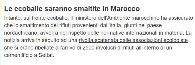 قالت وسائل اعلامية ايطاليا، ان الدولة الايطالية دفعت أكثر من 40 مليون أورو كغرامة للإتحاد الأوربي لعدم إلتزامها بمعالجة القمامة والنفايات، حيث تضرر 27 مليون إيطالي من هذه المعضلة، لهذا كان القرار هو التخلص منها في المغرب، بعد قبوله عرض السلطات الإيطالية.