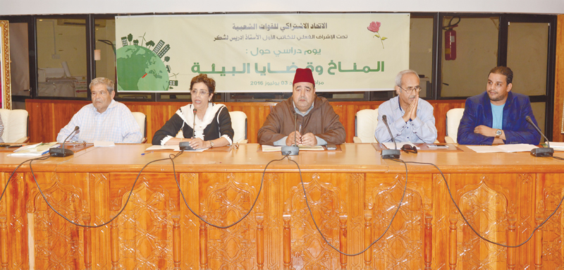 في إطار الدينامية التي تعرفها مختلف لجان و قطاعات الاتحاد الاشتراكي للقوات الشعبية و تنفيذا للبرنامج الذي سطرته اللجنة الوطنية للبيئة و في أفق انعقاد مؤتمر الأطراف الخاص باتفاقية الإطار للأمم المتحدة بشأن التغير المناخي الذي ستحتضنه بلادنا في شهر نونبر القادم، نظمت، ظهر يوم الأحد ثالث يوليوز الجاري بقاعة البلدية بشارع محمد السادس بمراكش، اللجنة الوطنية للبيئة و الشبيبة الاتحادية بمراكش بشراكة مع الكتابة الإقليمية للحزب بمراكش و تحت إشراف المكتب السياسي للاتحاد الاشتراكي للقوات الشعبية و بحضور الكاتب الأول الأستاذ ادريس لشكر، يوما دراسيا حول المناخ و قضايا البيئة بمشاركة مجموعة من الخبراء و الباحثين و فاعلين وطنيين في المجتمع المدني