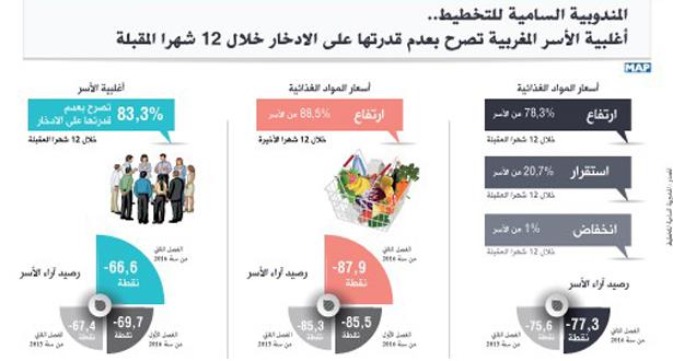 وجاء في مذكرة إخبارية للمندوبية السامية للتخطيط حول نتائج بحث الظرفية لدى الأسر للفصل الثاني من سنة 2016، أن رصيد آراء الأسر استقر في مستوى سلبي بلغ ناقص 66,6 نقطة برسم الفصل الثاني من سنة 2016، عوض ناقص69,7 نقطة خلال الفصل الأول من السنة الجارية وناقص 67,4 نقطة خلال الفصل الثاني من السنة الماضية.