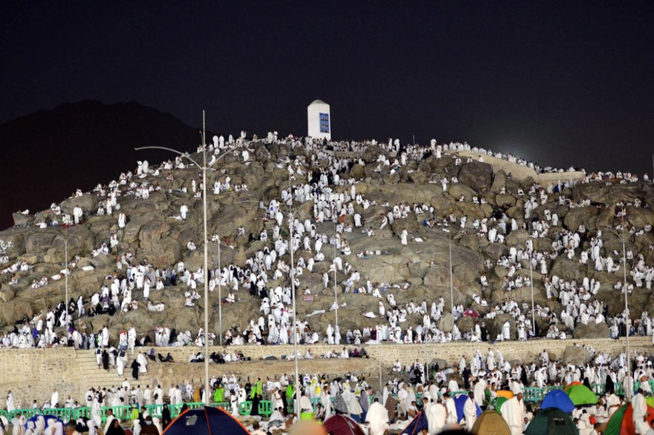 يستعد نحو 1,5 مليون مسلم جاؤوا من جميع انحاء العالم للصعود الى جبل عرفة فجر الاحد استعدادا لأداء ركن الحج الاعظم، بعد ان يمضوا ليلتهم في منى حيث تمتد الخيام البيضاء المقاومة للحريق.