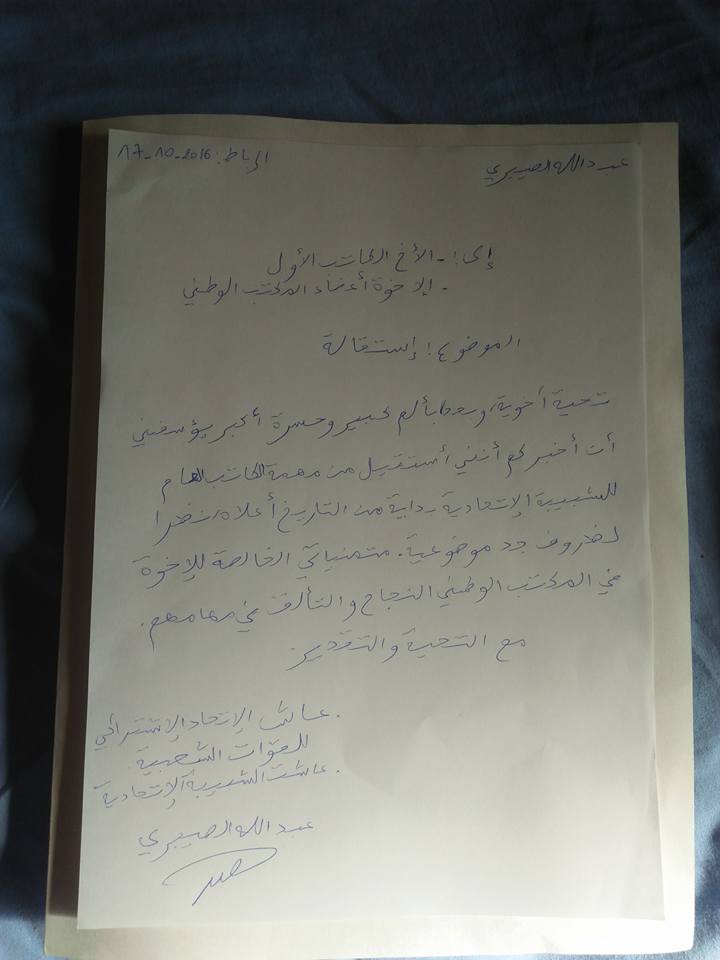 ووجه الصيباري رسالة استقالة الى الكاتب الوطني للحزب ادريس شلكر والمكتب الوطني للشبيبة الاتحادية,