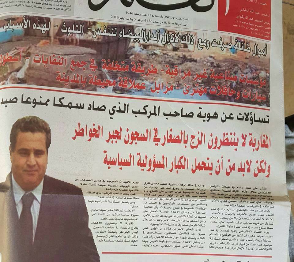 واضافت جريدة حزب الاستقلال “في حالة الوفاة المأساوية للفقيد محسن فكري بمدينة الحسيمة لم يجرؤ أحد على الحديث عن المسؤولية السياسية للوزير الوصي على القطاع، وردّ بعضهم سبب ذلك إلى أن الوزير الوصي على قطاع الصيد البحري هو في نفس الوقت رجل أعمال كبير ومستثمر من المستثمرين الرئيسيين في العديد من القطاعات خصوصا في قطاع المحروقات، وأن الغالبية الساحقة من وسائل الإعلام الوطنية تحصل على نصيبها من كعكة الاشهارات التي يوزعها المعني بالأمر، وعلق أحدهم ساخرا على هذا الأمر بالقول (إن دفتر شيكات الرجل ضخم وقادر على إسكات الجميع).وتساءلت “العلم” في مقال افتتاحي: “من يتحمل المسؤولية السياسية فيما حصل؟ ألا يعتبر وزير الفلاحة والصيد البحري مسؤولا سياسيا مباشرا عن المأساة التي ذهب ضحيتها شاب في مقتبل العمر.