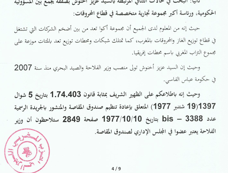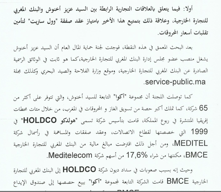 وعرضت رئيسة اللجنة المناضلة لبنى الفلاح التي عرضت خلاصات التقرير الثاني، الذي ركز على البحث عن أجوبة لتساؤلات المكتب السياسي، حول ما سماه” العلاقات الرابطة بين أخنوش والبنك المغربي للتجارة الخارجية، وحالات التنافي بين وزير الفلاحة ورئاسته لمجموعة أكوا المتخصصة في توزيع المحروقات، وكذا كشف كافة الشبهات حول مدى استغلال أخنوش لنفوذه من أجل تمتيع مجموعته الاقتصادية بامتيازات…”