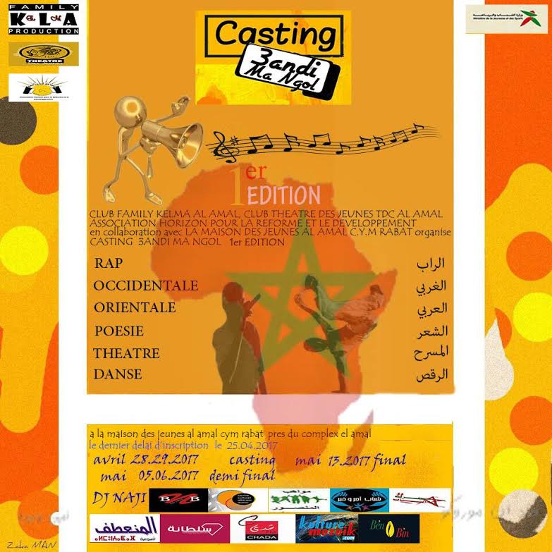 كما ان الكاستينغ الذي من المنتظر أن تكون نهائياته شهر ماي المقبل، ينظم بتعاون مع نادي مسرح الشباب الامل وجمعية الإصلاح و التنمية. وسيمر من مراحل التصفيات الاولى يومي 28 و 29 أبريل الحالي. على أن يكون إستكمال التسجيل للمترشحين في 24 من أبريل الحالي.