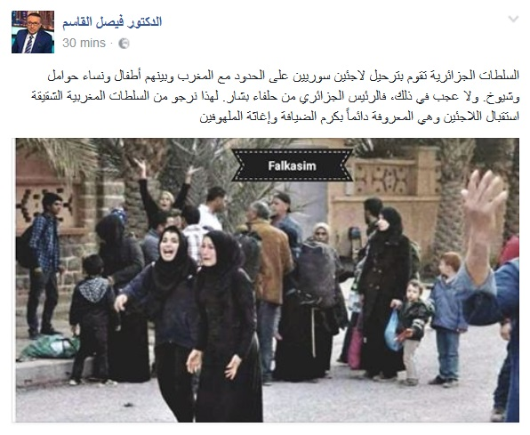 هاجم الاعلامي السوري فيصل القاسم نظام الجزائر على خلفية طرده للاجئين السوريين من الأراضي الجزائرية، حيث كتب في تدوينة له على مواقع التواصل الاجتماعي، أنه لا عجب أن تقوم الجزائر بذلك “فالرئيس الجزائري من حلفاء بشار”.