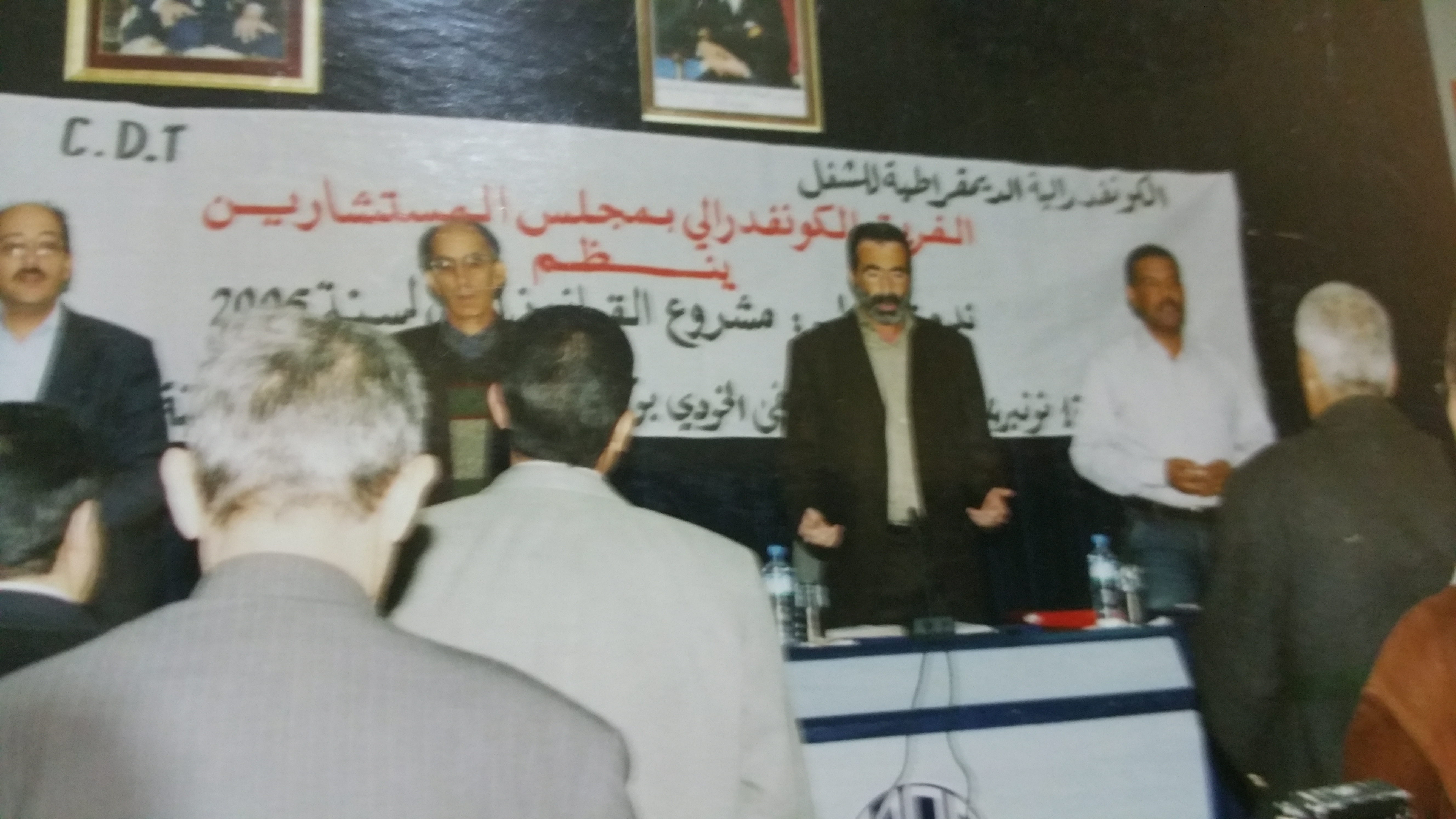 الصورة تجمع الزعيم النقابي المصطفى الشطاطبي المستشار البرلماني وخالد هوير العلمي رئيس الفريق الكونفدرالي بمجلس المستشارين و محمد دعيدعة عضو الفريق الكونفدرالي والأستاذ عبد القادر برادة في الندوة الفكرية الثانية التي نظمها الفريق الكونفدرالي بمجلس المستشارين حول مشروع القانون المالي لسنة 2005 وذلك يوم الأربعاء 17 نوفمبر 2004 بقاعة مصطفى الخودي بوكالة المغرب العربي للانباء بالرباط، حول ” مشروع القانون المالي لسنة 2005 ما بين الاستمرارية والتجديد أمام هول الاختلالات الاقتصادية والاجتماعية وحجم الانتظارات المجتمعية؛”.